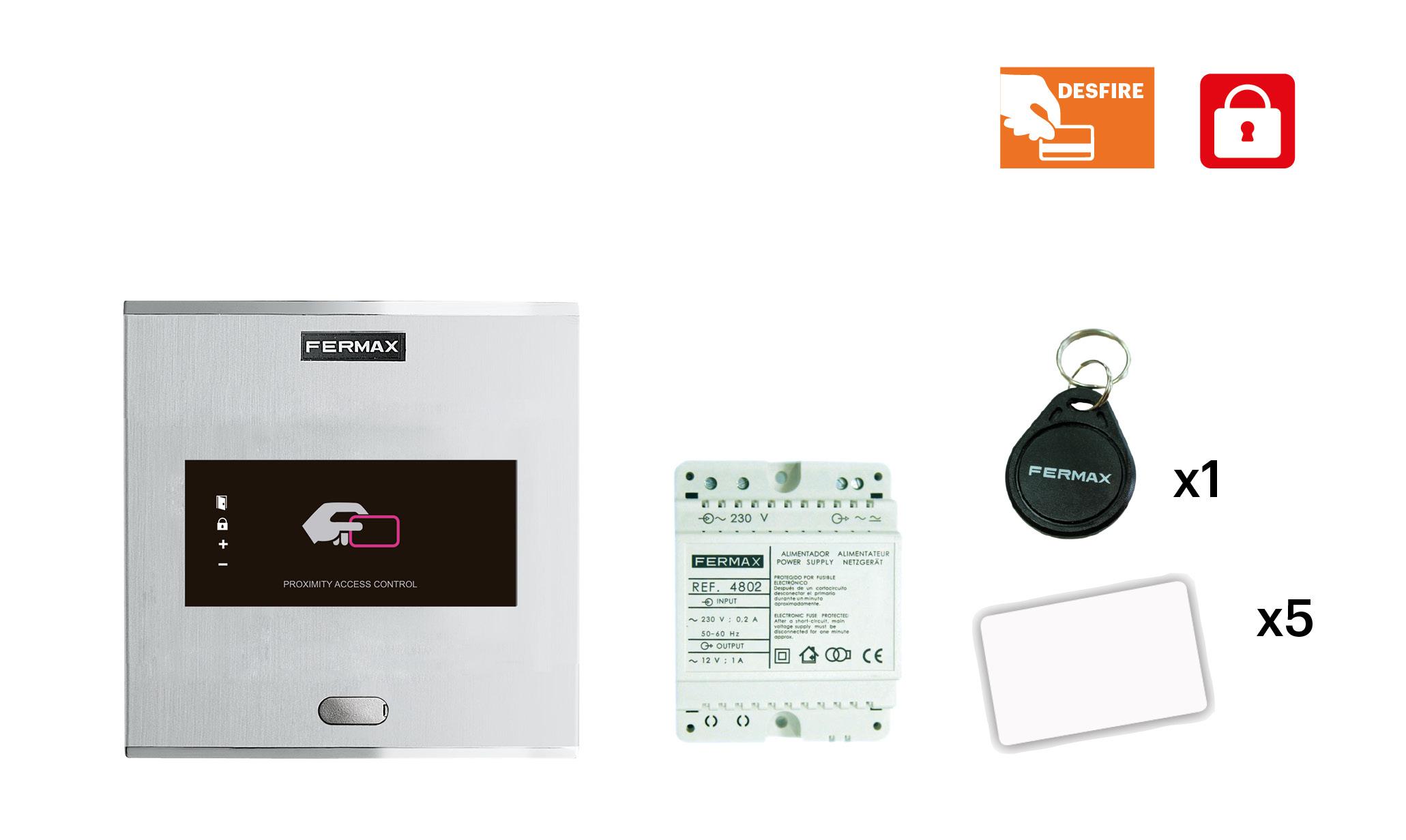 Kit de control de accesos antivandálico autónomo por teclado y proximidad de hasta 600 usuarios. Incluye teclado con controlador integrado, 3 tarjetas, 2 llaveros y una fuente de alimentación