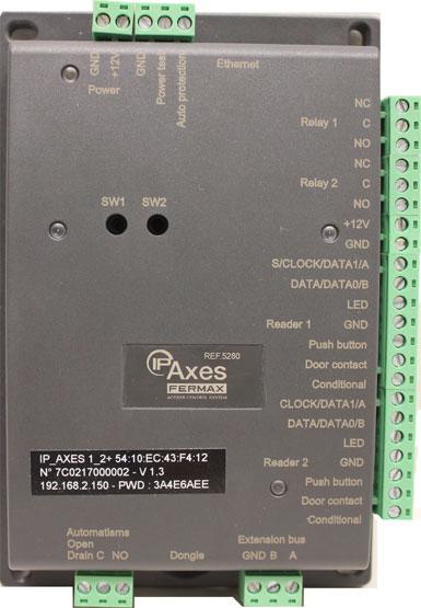 Central de control de accesos IP-AXES TCP/IP con la posibilidad de gestionar hasta 2 puertas. Permite ampliarse añadiendo módulos de expansión de 4 puertas o módulos I/O hasta 10 expansores por central.
