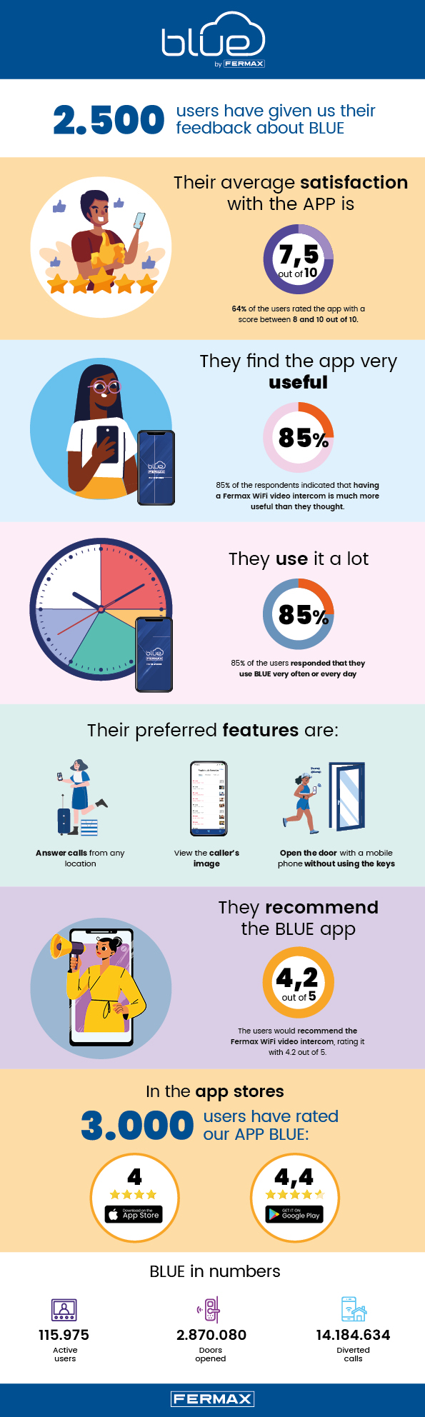In March, we conducted a survey among 2,500 BLUE by Fermax users to find out their satisfaction with the app after updating it to the recent version and incorporating new features such as automatic image capture and direct door opening.